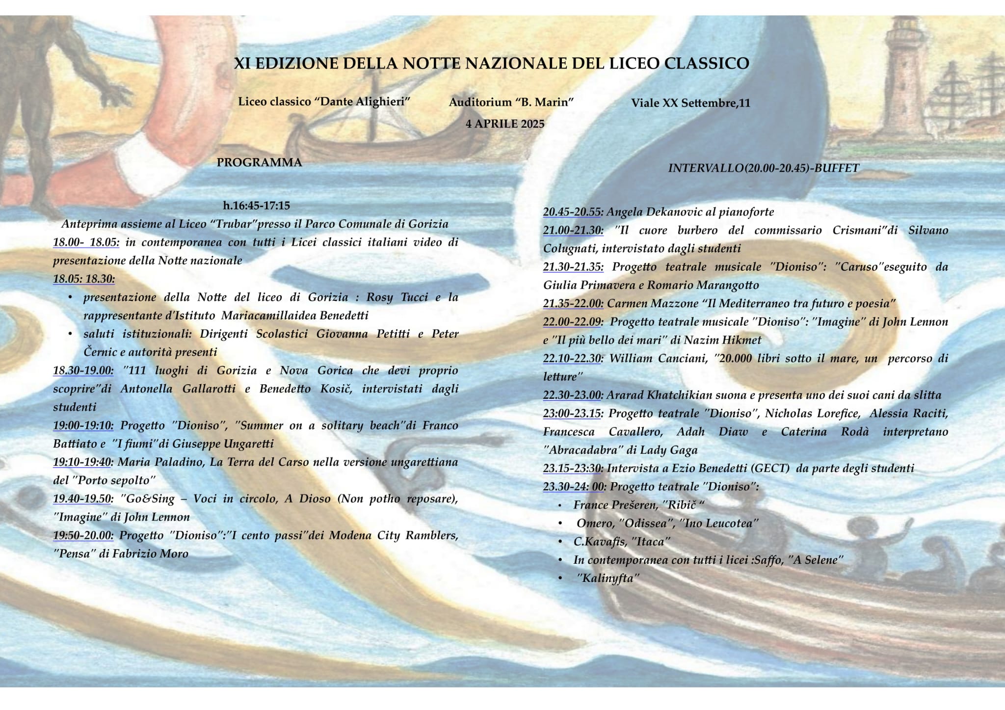 Venerdì 4 aprile, dalle 18 alle 24, una vera e propria maratona di momenti culturali darà vita alla Notte nazionale del Liceo classico, nell'auditorium Biagio Marin del Liceo classico Dante, in viale XX Settembre.