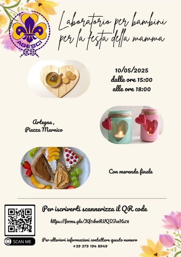 Sabato 10 maggio 2025, Piazza Marnico, in occasione della Festa della Mamma il Gruppo Scout AGESCI di Artegna, organizza un laboratorio per bambini.