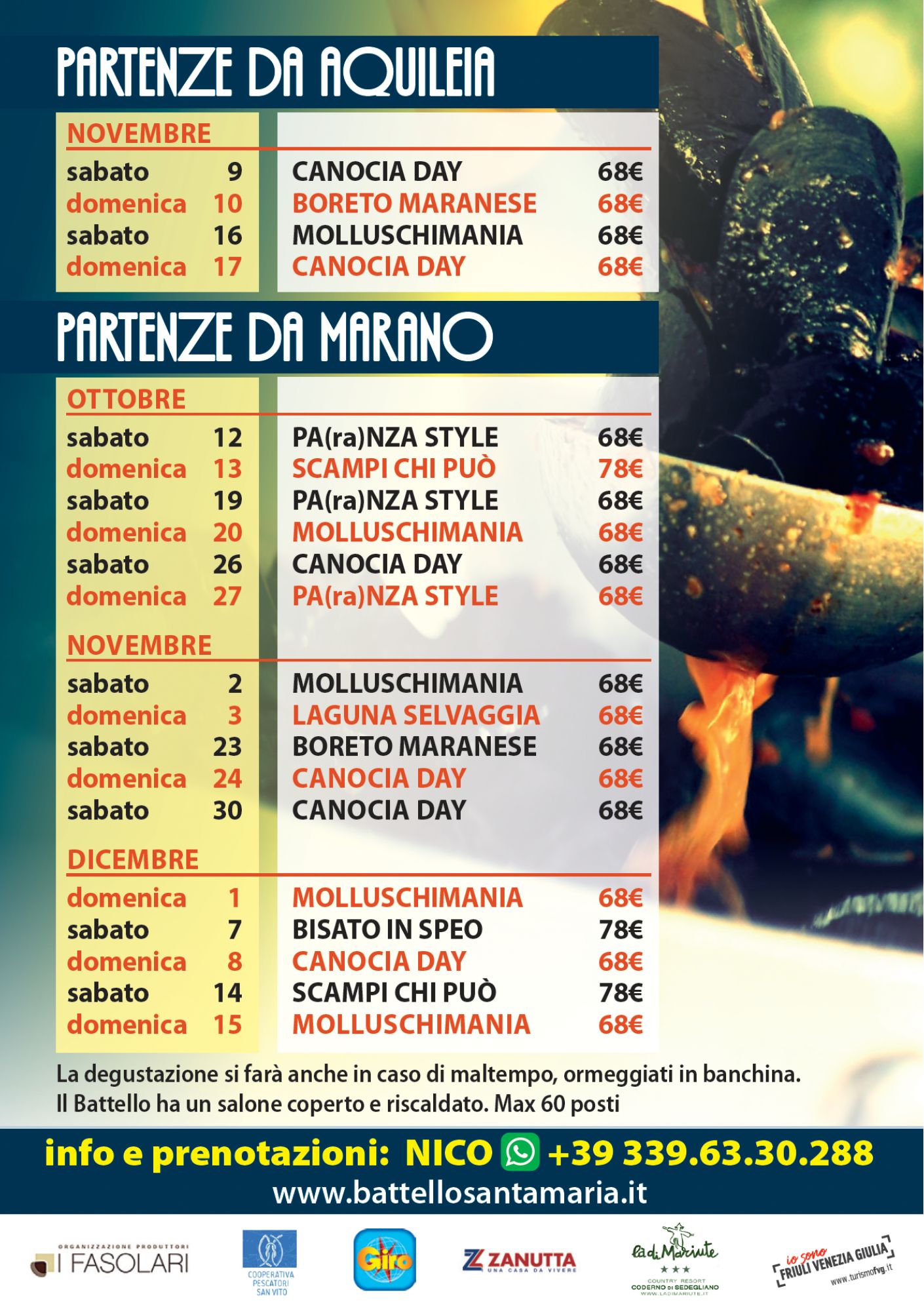 Partenze da Marano Lagunare e da Aquileia. Menù con tre antipasti, primo e secondo in base al tema della giornata.