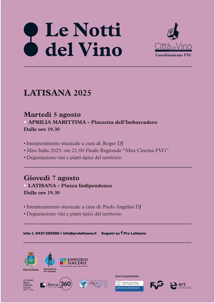 "Le Notti del Vino", l'evento ideato dalle Città del Vino Friuli Venezia Giulia, si svolgerà a Latisana giovedì 7 agosto.