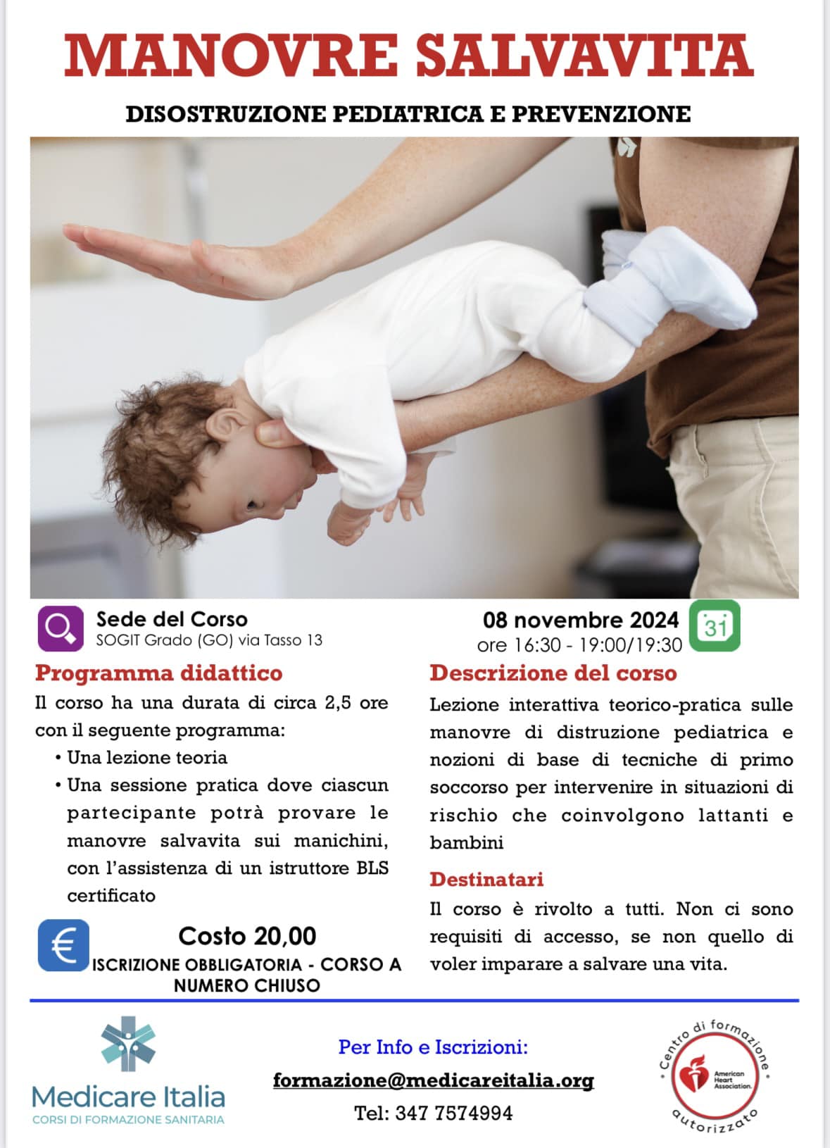 Lezione interattiva teorico-pratica sulle manovre di disostruzione pediatrica e nozioni di base di tecniche di primo soccorso per intervenire in situazioni di rischio che coinvolgono lattanti e bambini.