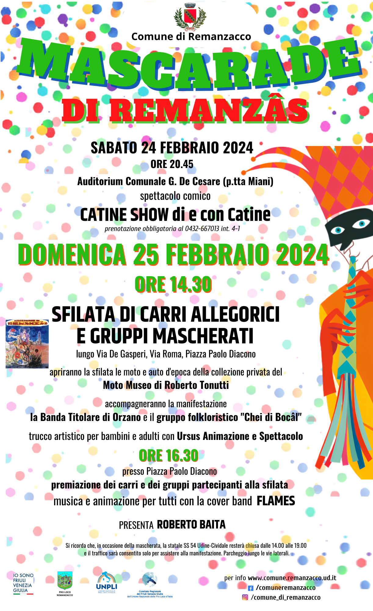 Domenica 25 febbraio alle 14.30 si rinnoverà lo storico appuntamento della 'Mascarade di Remanzâs' con la sfilata di numerosi carri allegorici e gruppi mascherati provenienti da tutta la regione lungo Via De Gasperi, Via Roma, Piazza Paolo Diacono. La sfilata sarà aperta dalle moto d’epoca della collezione privata del Moto Museo di Roberto Tonutti e sarà accompagnata dalla musica della Banda Titolare di Orzano e dalle danze tradizionali del gruppo folkloristico “Chei di Bocâl”. Il pubblico dei più piccoli e non solo potrà divertirsi con l’animazione per bambini ed il trucco artistico di Ursus Animazione e Spettacolo.