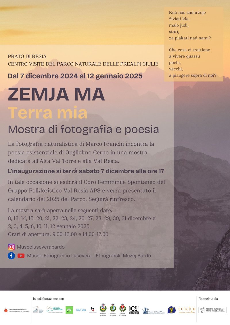 Fino al 12 gennaio 2024, presso il centro visite del Parco, sarà visitabile la mostra temporanea di fotografia paesaggistica e poesia esistenziale "Terra mia | Zemja ma". Gli autori sono rispettivamente Marco Franchi, fotografo naturalista attivo in regione e all'estero, e Guglielmo Cerno, indimenticata figura di riferimento per la comunità dell'Alta Val Torre e di Lusevera in particolare.