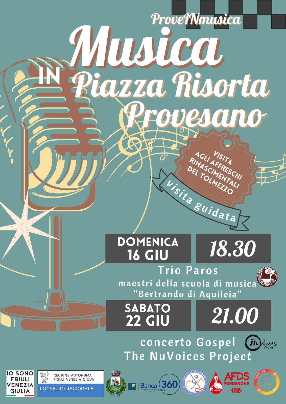 Domenica 16 giugno primo appuntamento della rassegna di musica in piazza a Provesano. Dalle 18:30 cover di successi di musica italiana e colonne sonore proposte dal Trio Paros, formato da tre maestri della scuola di musica “Bertrando di Aquileia” di S. Giorgio (allo spettacolo interverranno anche due allievi di Provesano). Inoltre, per l’occasione la chiesa resterà aperta e ci sarà la possibilità di partecipare a una visita guidata agli affreschi di Gianfrancesco da Tolmezzo.