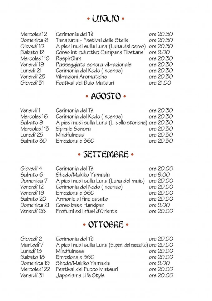 Domenica 7 settembre 2025 si svolgerà l'evento intitolato "A piedi nudi sulla Luna (Luna del mais)". La serata prevede una passeggiata guidata, l'accensione della propria "fiamma" ed un momento di rilassamento con il risveglio dei sensi, seduti ad osservare la bellezza del giardino Zen, illuminato dalle candele. Degustazione finale con un tè giapponese selezionato. (Pratico - 12 posti).