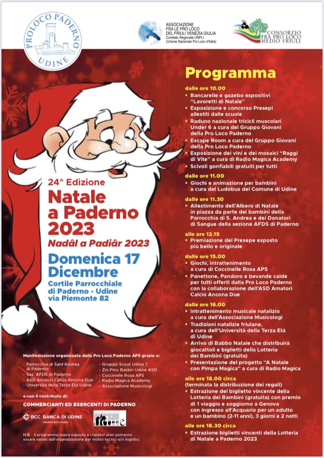 Mercatino natalizio a cura delle scuole del quartiere, esposizione e premiazione dei presepi, allestimento ed accensione dell’albero di Natale, giochi a cura del Ludobus del Comune di Udine, scivoli gonfiabili, raduno nazionale tricicli muscolari.