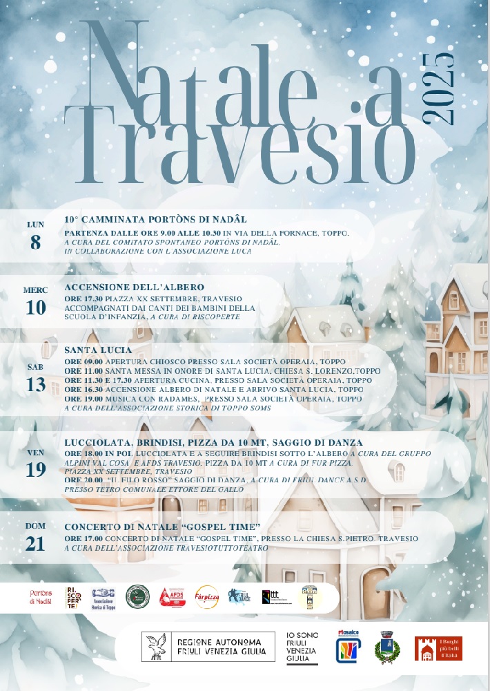Il calendario natalizio di Travesio affianca alla camminata tra i portoni addobbati una serie di iniziative corali e momenti di comunità.