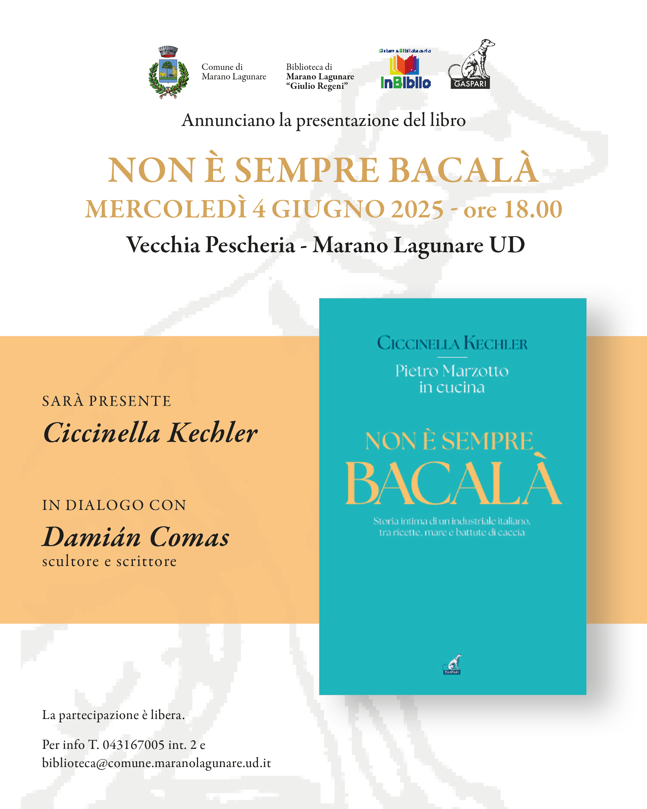 Presentazione del libro intitolato "Non è sempre Bacalà". Sarà presente l'autrice Ciccinella Kechler che dialogherà con Damián Comas, scultore e scrittore.
