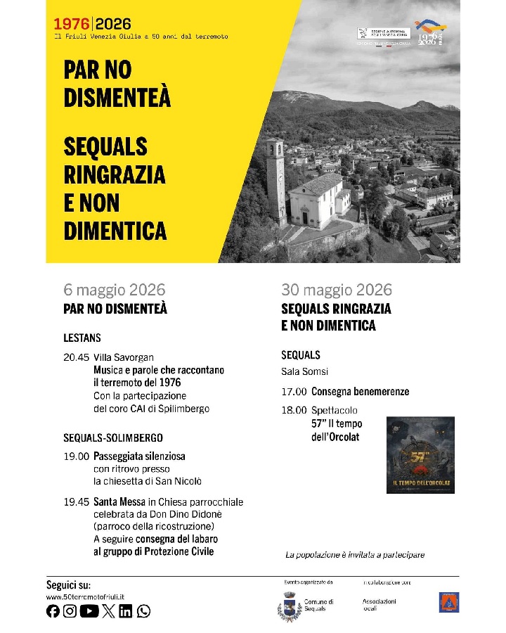 Il Comune di Sequals commemora il 50° anniversario del sisma con i seguenti appuntamenti: