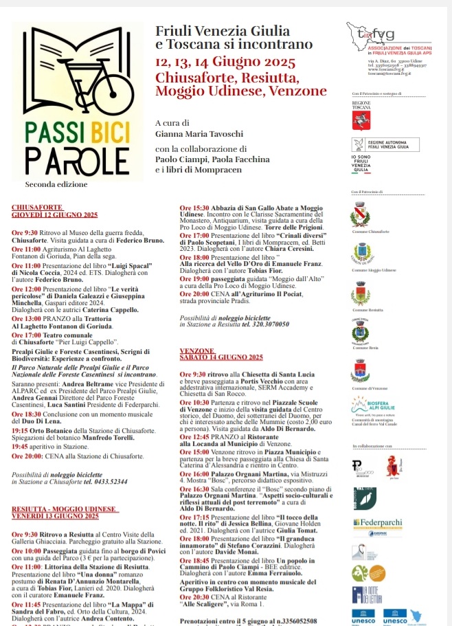 Si tratta di una iniziativa che intende interfacciare il territorio del Friuli Venezia Giulia e quello della Toscana mediante la presentazione di libri di scrittori/scrittrici delle due regioni che dialogheranno con i presentatori e con il pubblico delle località attraversate dalla ciclovia Alpe Adria: Venzone, Moggio Udinese, Resiutta, Chiusaforte. Un tratto distintivo di questa edizione 2025 di PASSI, BICI, PAROLE : i presentatori saranno persone di età inferiore ai 35 anni. Pertanto un’iniziativa “giovane” che coinvolge persone d’ogni età durante la presentazione dei libri ma anche nelle occasioni correlate: trasferimenti in bici o a piedi, partecipazione a eventi musicali e culturali, esplorazione dei Comuni e delle località, assaggi gastronomici dei cibi tipici del Friuli e del Canal del Ferro, pernottamenti in loco. Peculiarità dell’edizione 2025 sarà il primo incontro a Chiusaforte, presso il Teatro Pierluigi Cappello, fra il Parco Naturale delle Alpi Giulie e il Parco Nazionale delle Foreste Casentinesi durante il quale verrà trattato il tema delle biodiversità ma anche delle somiglianze fra i due territori con un dialogo fruttifero di idee, di contatti, di voglia di conoscersi. Hanno qualcosa in comune i Borghi, i corsi d’acqua, le cascate, i sentieri, la flora, la fauna dei due Parchi oppure ognuno di essi nasconde degli scrigni particolari che val la pena di scoprire?