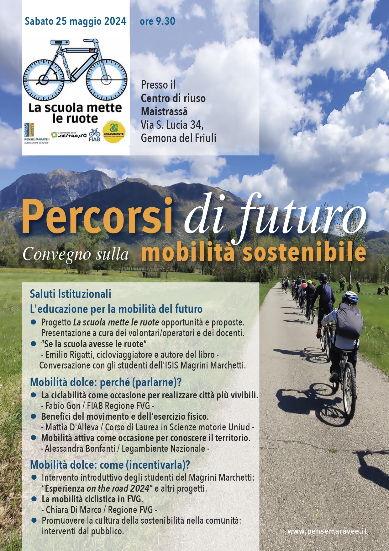 Pense e Marvee, Centro del riuso Maistrassà, Circolo di Legambiente della pedemontana del gemonese, Fiab aBicitUdine sono lieti di invitarvi al convegno “Percorsi di futuro, convegno sulla mobilità sostenibile” sabato 25 Maggio alle ore 9:30 presso il Centro del riuso Maistrassâ promosso dall' associazione gemonese Pense e Marvee, dal Centro del riuso Maistrassà, dal Circolo di Legambiente della pedemontana del gemonese e da Fiab aBicitUdine, nell'ambito del progetto "La scuola mette le ruote", quest'anno giunto alla quinta edizione.