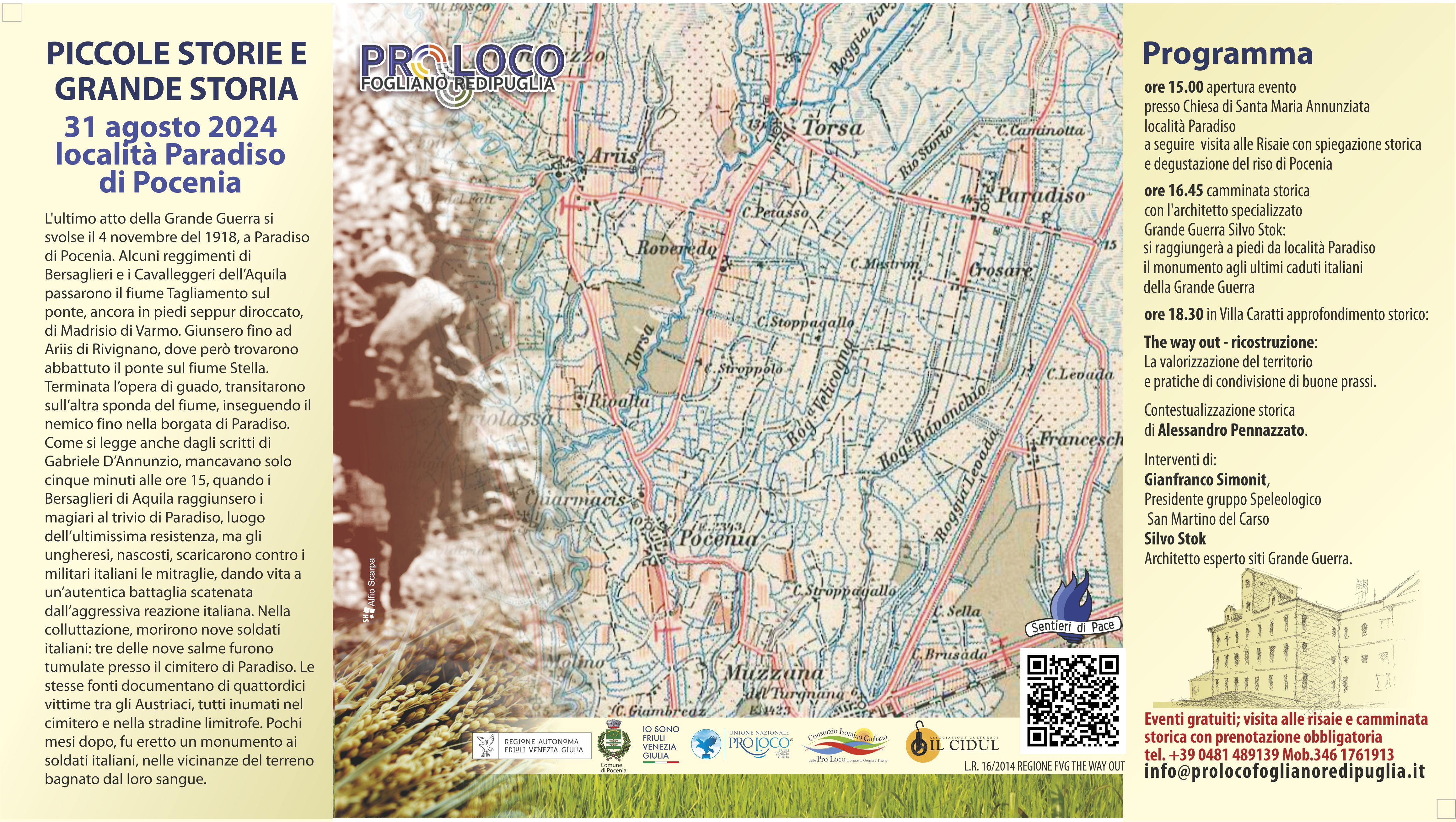 Ore 15:00 Ritrovo presso la Chiesa di Santa Maria Annunziata, località Paradiso; a seguire visita alle risaie, camminata storica e degustazione del riso di Pocenia.