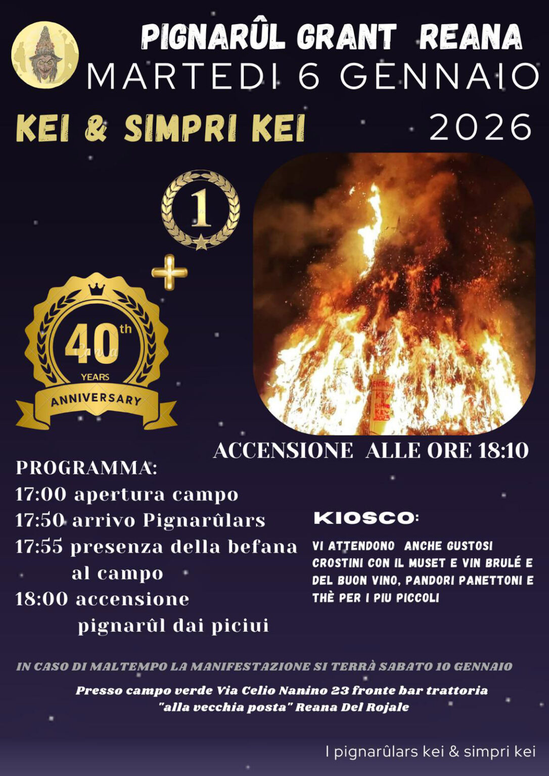 Martedì 6 Gennaio, si accenderà il grande falò epifanico anche a Reana del Rojale! L’accensione è prevista per le ore 18.10 e sarà preceduta dall’apertura dei chioschi (ore 17) che offrirà panino con salsiccia e cipolle, lonza, crostini con il muset, pandori e panettoni e bevande calde e fredde per tutti. Non mancherà l’arrivo della befana e il pignarûl dei bambini.