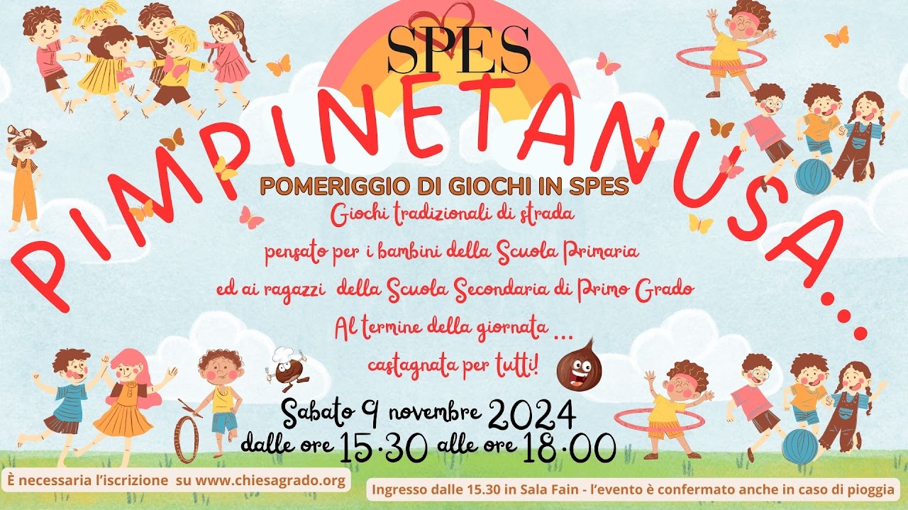 "PIMPINETANUSA" intrattenimento e giochi tradizionali di strada per bambini della scuola primaria e per ragazzi della scuola secondaria di primo grado presso il ricreatorio SPES, presso la sala Monsignor Fain.