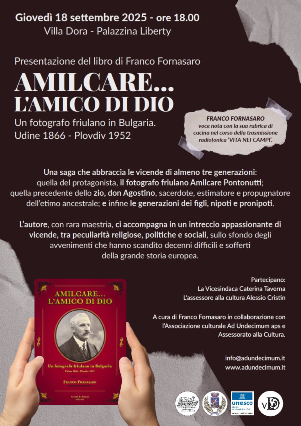 Giovedì 18 settembre 2025, alle ore 18.00, presso la Palazzina Liberty di Villa Dora di San Giorgio di Nogaro, si terrà la presentazione del libro "Amilcare...l'amico di Dio - Un fotografo friulano in Bulgaria. Udine 1866 - Plovdiv 1952" di Franco Fornasaro.