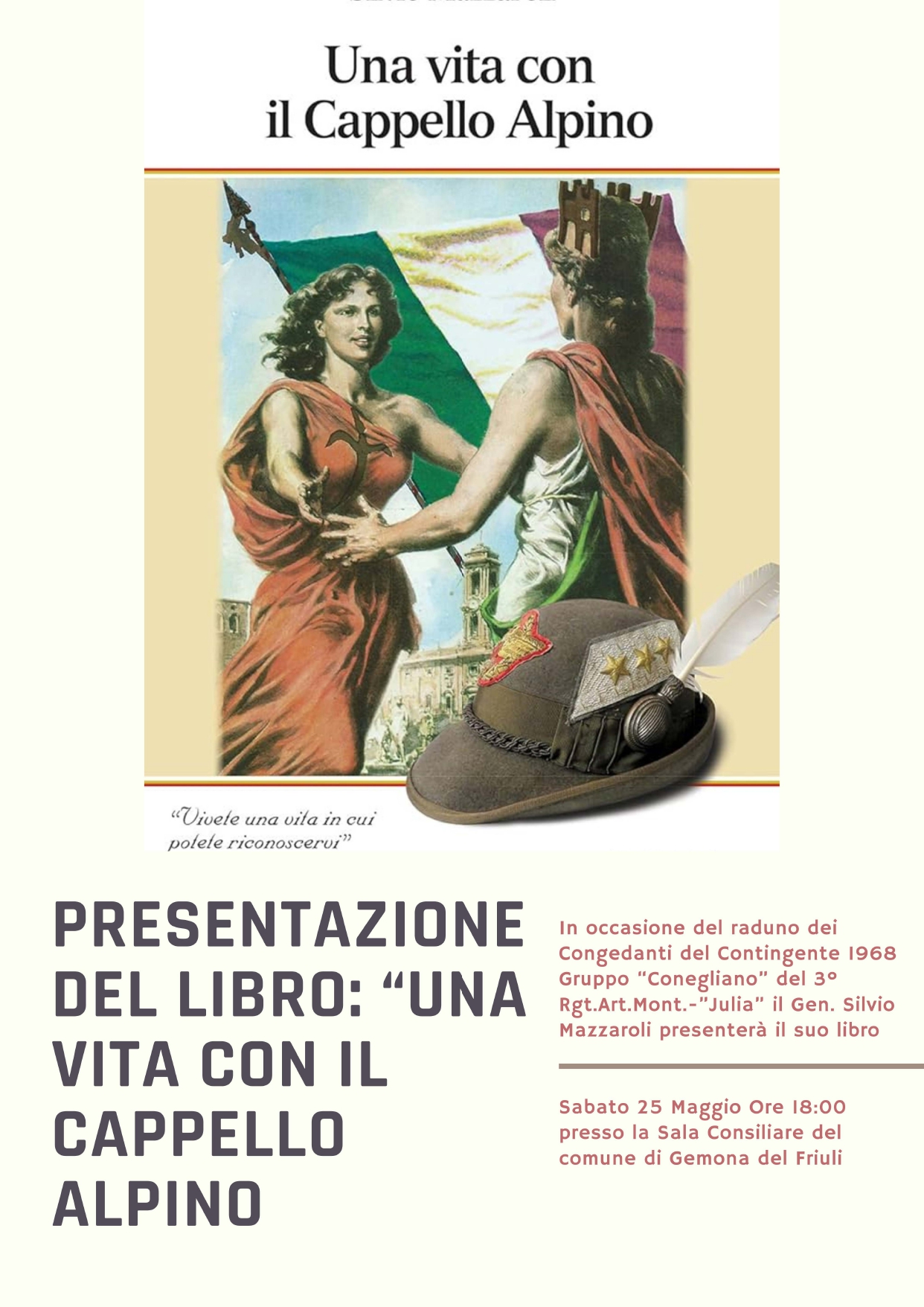 Si terrà sabato 25 maggio alle ore 18.00 presso la Sala Consiliare del Comune di Gemona la presentazione del libro "Una vita col cappello alpino" del Gen. Silvio Mazzaroli, in occasione del raduno dei Congedanti del Contingente 1968 Gruppo "Conegliano" del 3^ Rgt. Art. Mont.-"Jul