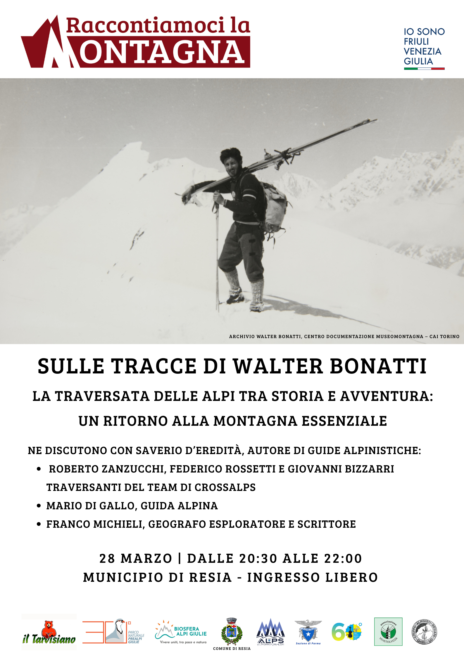 Nell’ambito della rassegna “Raccontiamoci la Montagna” sabato 28 marzo alle ore 20.30 presso il Municipio di Resia ci sarà un'incontro dedicato al 70esimo anniversario della traversata delle Alpi di Walter Bonatti dal titolo:
