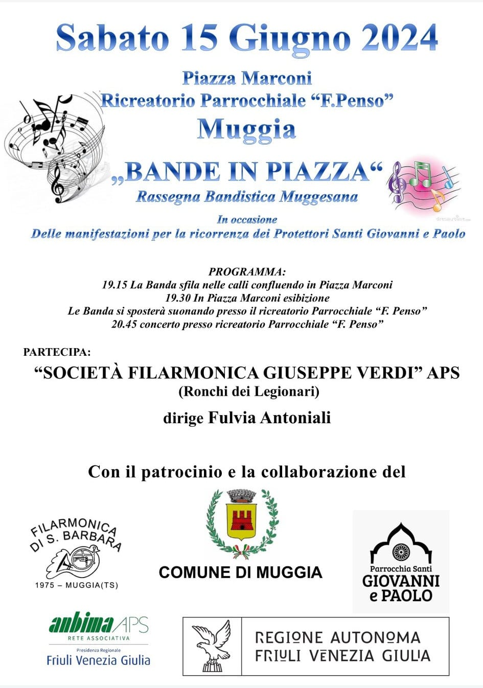 Sabato 15 giugno 2024 avrà luogo l'evento "Bande in piazza" una rassegna bandistica muggesana in occasione delle manifestazioni per la ricorrenza dei Protettori Santi Giovanni e Paolo.