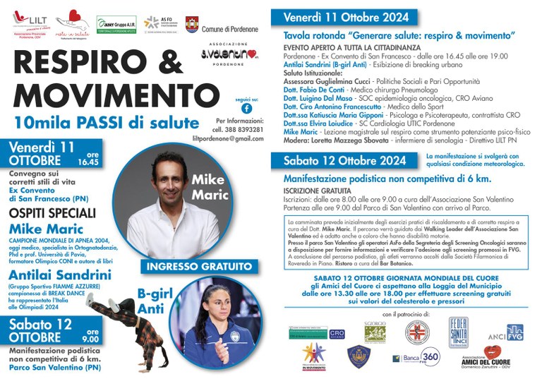 L’iniziativa “Respiro & Movimento, 10mila PASSI di salute”, nell’ottica di promozione della salute, pone particolare attenzione alla prevenzione oncologica organizzando l’11 ottobre un convegno sui corretti stili di vita all’Ex Convento di San Francesco e il 12 ottobre una manifestazione podistica non competitiva di 6 km con partenza dal Parco San Valentino.