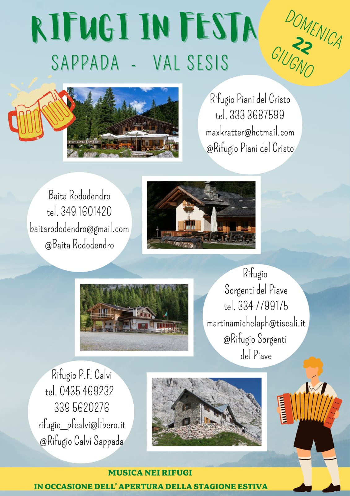 Al Rifugio Calvi, Rifugio Sorgenti del Piave, Baita Rododendro e Rifugio Piani del Cristo vi aspetterà musica e animazione.