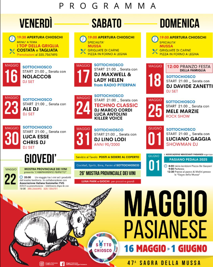 Dal 16 maggio al 1° giugno torna a Pasiano di Pordenone la 47ª edizione della Sagra della Mussa, meglio conosciuta come Maggio Pasianese.
