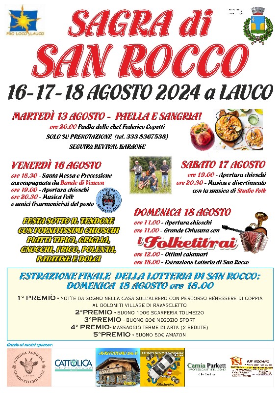 Tradizionale festa paesana sotto il tendone con fornitissimi chioschi, piatti tipici, griglia, gnocchi, frico, polenta, patatine e dolci.