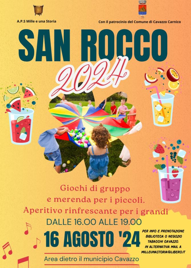 L'associazione “Mille e una Storia” organizza per venerdì 16 agosto, in occasione del Santo Patrono, San Rocco, giochi e merenda per i più piccoli e un aperitivo per gli adulti. A partire dalle 16.00, nell'area retrostante il Municipio.