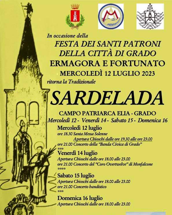 Sardelada in Campo Patriarca Elia: in occasione della festa dei Santi Patroni SS.Ermacora e Fortunato, l'Associazione dei Portatori della Madonna di Barbana, in collaborazione con il Comune di Grado e la Parrocchia di Grado, organizza la tradizionale Sardelada in Campo Patriarca Elia.