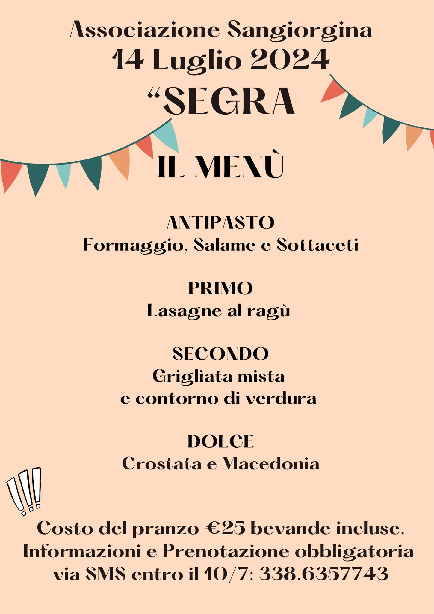 Prenotazione obbligatoria via SMS entro il 10/07 al numero 338 6357743