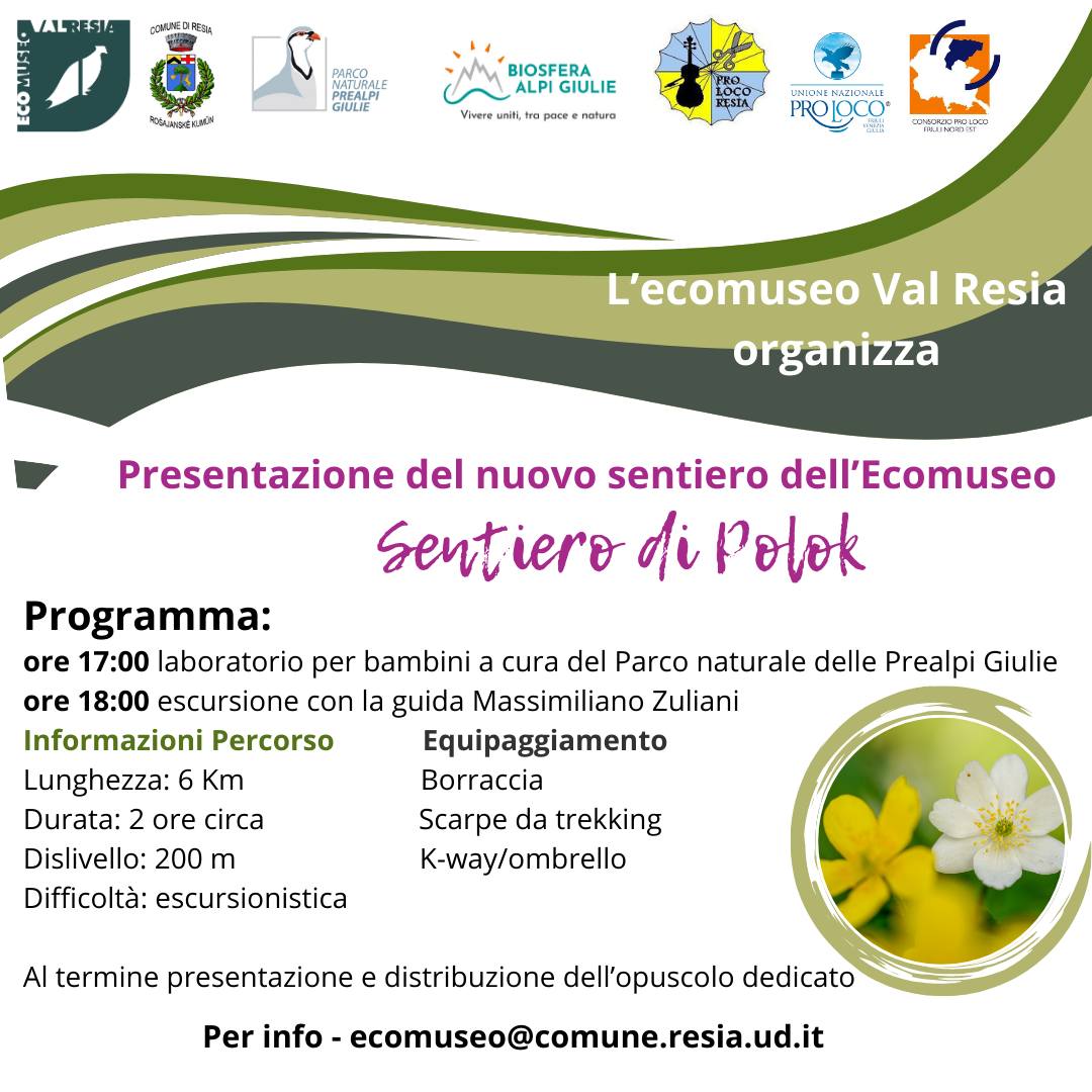 Alle ore 17:00 laboratorio per bambini a cura del Parco naturale delle Prealpi Giulie ed a seguire, alle ore 18:00 escursione lungo il sentiero con la guida Massimiliano Zuliani. Al termine dell'evento sarà presentato e distribuito l'opuscolo bilingue italiano/inglese realizzato per l'occasione con il prezioso contributo di Candolini Alberto e relativo al sentiero.