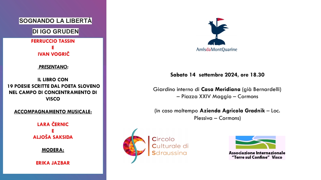 Il 14 settembre 2024, ore 18.30, nel giardino interno di Casa Meridiana, ex Bernardelli, Piazza XXIV Maggio, Cormons (in caso di maltempo, Azienda Agricola Gradnik, localitร Plessiva, Cormons),l'Associazione Amรฎs da Mont Quarine, in collaborazione con il Circolo Culturale di Sdraussina e l'Associazione internazionale "Terre di Confine" Visco, รจ lieta di invitarvi alla serata "Sognando la libertร ", il libro che raccoglie 19 poesie scritte dal poeta sloveno Igo Gruden. La serata vedrร l'intervento del prof. Ferruccio Tassin e di Ivan Vogriฤ. L'intervento sarร accompagnato dalla musica di Lara ฤernic e Alojoลกa Saksida.