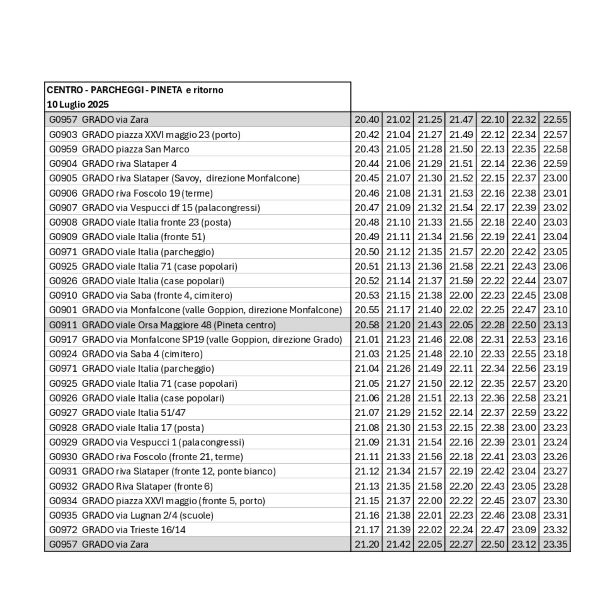 Per l'occasione sarà attivo un servizio di bus navetta gratuito con partenza dal centro ed arrivo a Grado Pineta con fermate intermedie (dettagli orari e fermate nella locandina allegata)