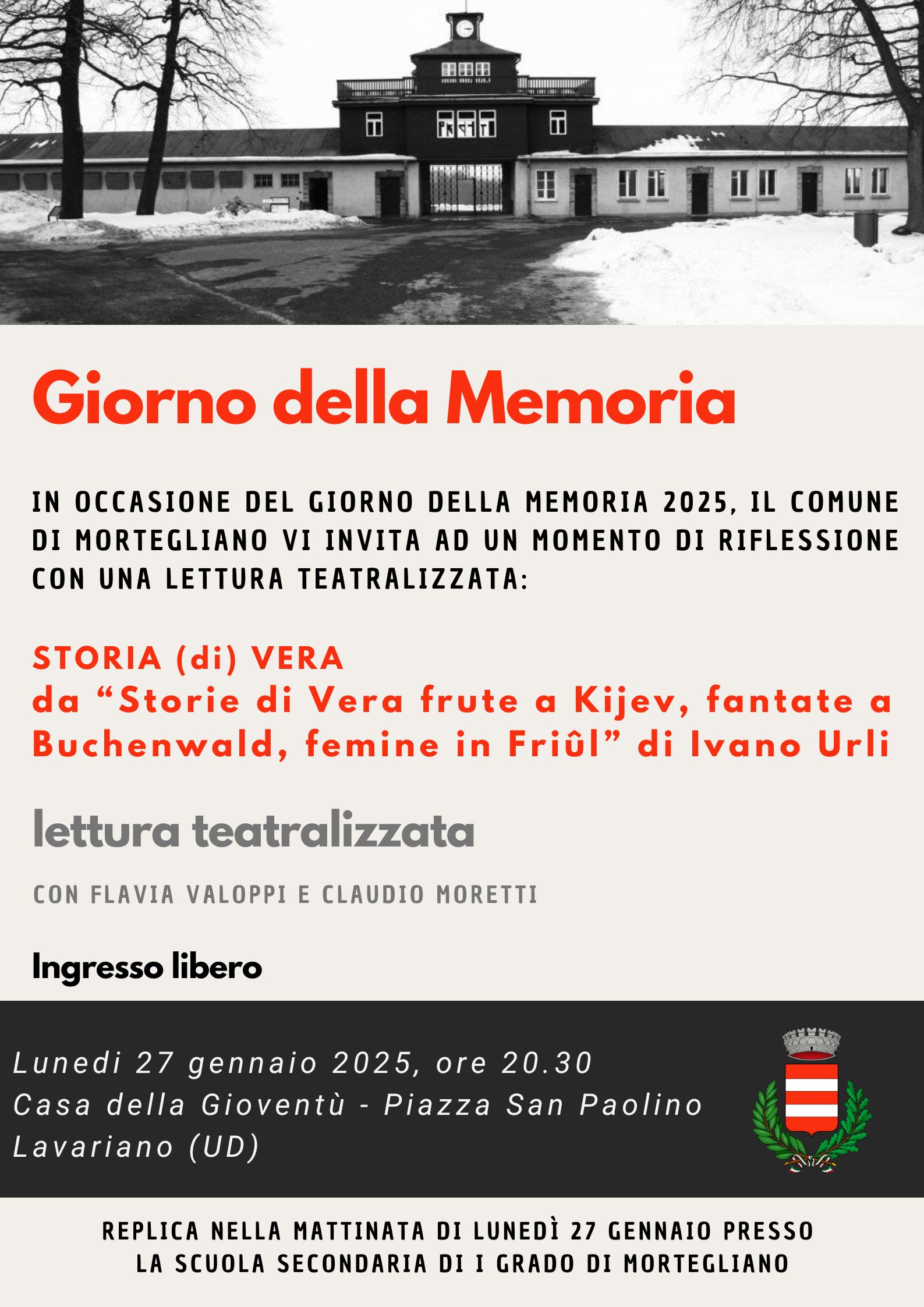 In occasione del GIORNO DELLA MEMORIA 2025 il Comune di Mortegliano vi invita ad un momento di riflessione con la lettura teatralizzata di e con Flavia Valoppi e Claudio Moretti: