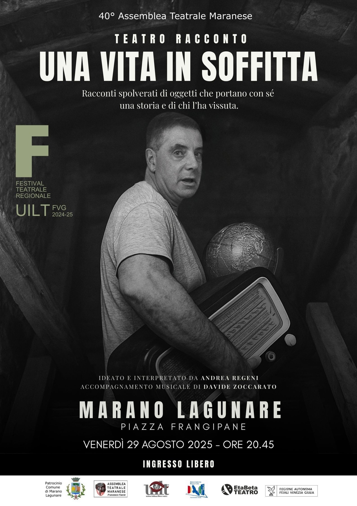 Venerdì 29 agosto, alle ore 20.45, presso la Piazza Frangipane di Marano Lagunare, si terrà l'evento "Teatro racconto: Una vita in soffitta". Racconti spolverati di oggetti che portano con sè una storia e di chi l'ha vissuta.