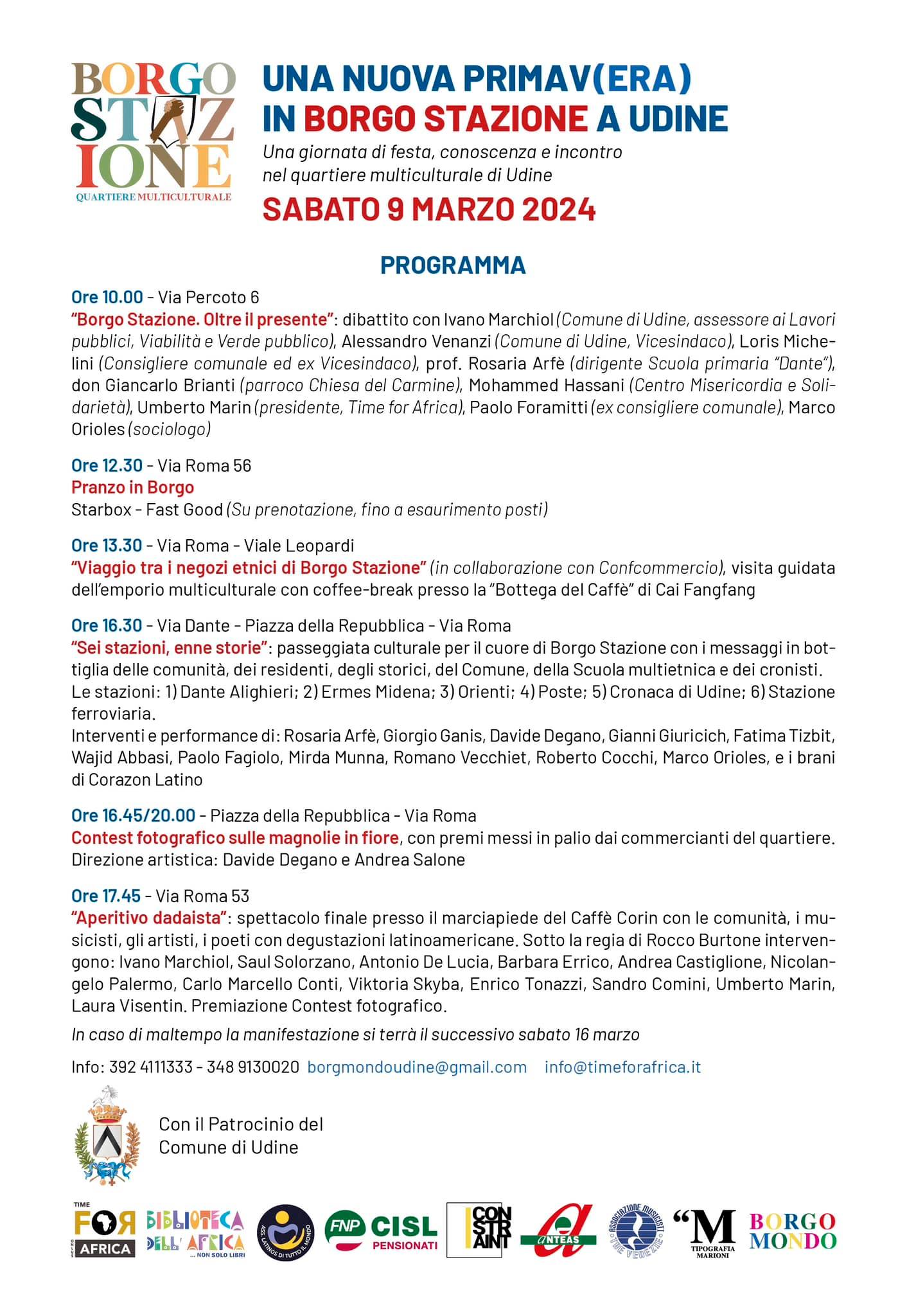 - Ore 10.00 in Via Percoto 6 - "Borgo stazione. Oltre il presente", dibattito con Ivano Marchiol (assessore del Comune di Udine), Alessandro Venanzi (Vicesindaco del Comune di Udine), Loris Michelini (Consigliere comunale ed ex Vicesindaco), prof. Rosaria Arfè (dirigente Scuola primaria "Dante"), don Giancarlo Brianti (parroco Chiesa del Carmine), Mohammed Hassani (Centro Misericordia e Solidarietà), Umberto Marin (presidente Time for Africa), Paolo Foramitti (ex consigliere comunale), Marco Orioles (sociologo)