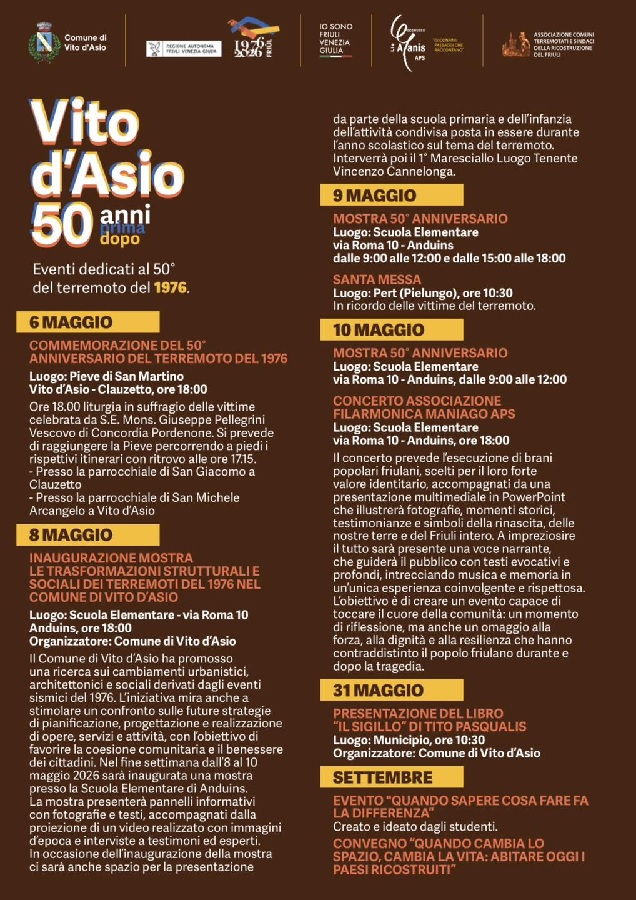 Il programma completo degli eventi che presentiamo oggi è il frutto del lavoro appassionato di un’intera comunità. Vogliamo ringraziare di cuore l'ASD Arzino, la Storica SOMSI di Vito d'Asio, l'Ecomuseo delle Dolomiti Friulane APS, il Gruppo di Protezione Civile comunale, la parrocchia, le scuole, insieme a ex amministratori e a decine di cittadini che hanno donato tempo, memorie e preziose testimonianze.