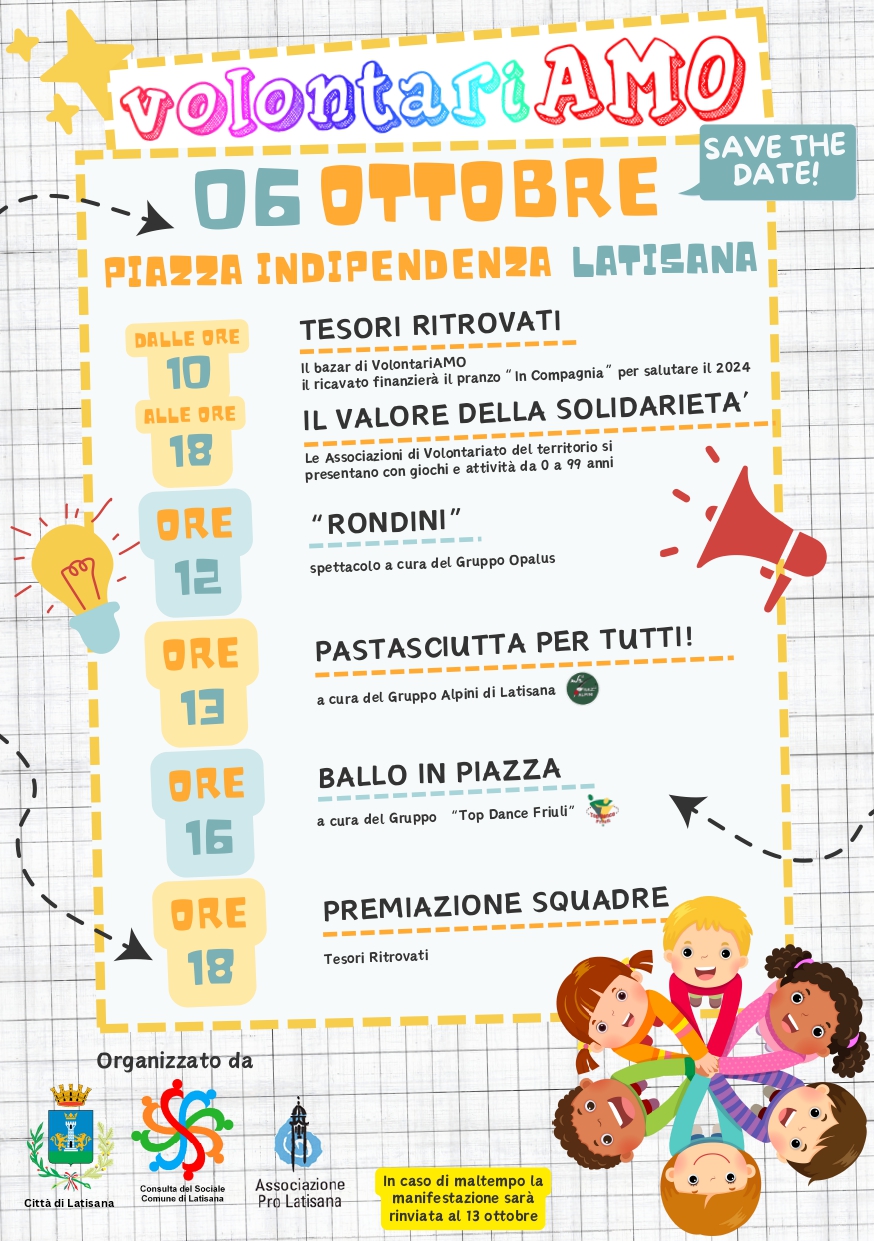 Domenica 06 ottobre, in Piazza Indipendenza a Latisana, dalla mattina alle sera, un'intera giornata dedicato al volontariato, organizzata dalla Consulta del Sociale.