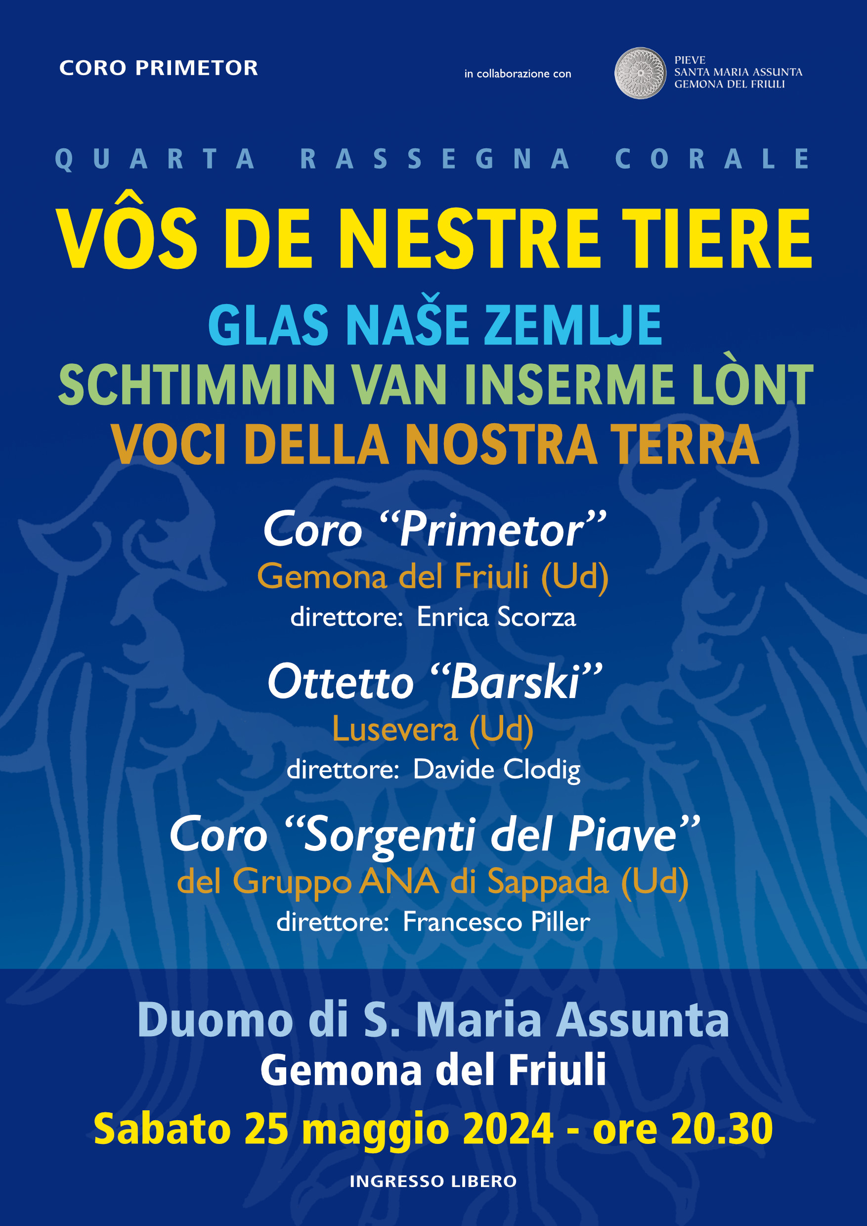 Sabato 25 maggio alle ore 20.30 a Gemona del Friuli nel Duomo di S. Maria Assunta, si terrà la quarta rassegna corale intitolata “Vôs de nestre Tiere”, organizzata dal coro Primetor, che si esibirà assieme all'ottetto "Barski" di Lusevera e al Coro Sorgenti del Piave di Sappada.
